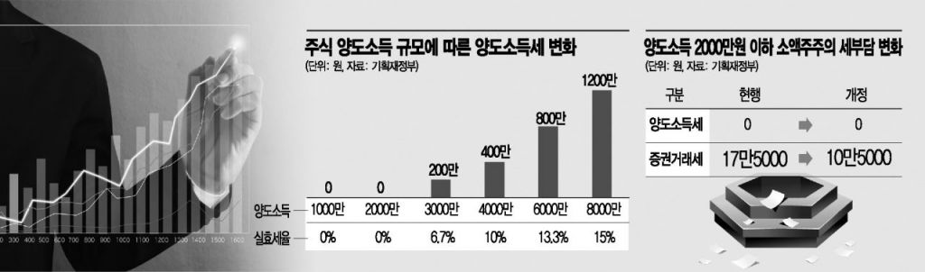 다만 금융투자를 통해 2000만원 넘게 버는 투자자 입장에서는 이번 세제개편으로 부담이 대폭 늘어나게 되는 게 사실이다. 주식에서 4000만원을 번 투자자 A씨의 상황을 가정하면 법개정 전 거래세 35만원만 내던 것에서 양도소득세 400만원에 거래세 21만원, 총 421만원의 세금을 내야한다. 35만원에서 421만원으로 증가율은 1102.8%에 달한다. A씨 입장에서는 증세가 분명하다며 분개할 만 하다.