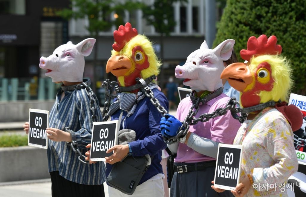 비건을 지향하는 사람들의 모임인 비지모 회원들이 28일 서울 광화문 광장에서 동물해방, 동물권리를 촉구하는 퍼포먼스를 갖고 있다./윤동주 기자 doso7@