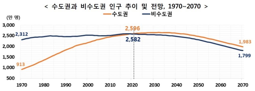 수도권 인구는 1970년 913만명에서 2020년 2596만명으로 지난 50년간 184.4%(1683만명) 증가한 뒤 2032년(2650만 명)을 정점으로 감소할 전망이다. 2070년에는 1983만명에 이를 전망으로 2020년 대비 향후 50년간 23.6%(613만 명) 감소할 전망이다.