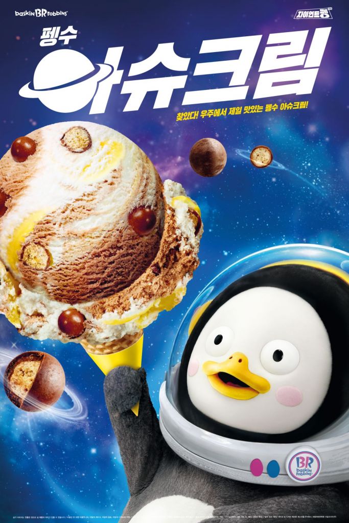 배스킨라빈스의 ‘펭수 아슈크림’은 ‘펭수와 만난 슈크림’이라는 뜻을 담은 제품으로, ‘아이스크림’과 ‘슈크림’을 결합해 ‘아슈크림’이라는 이름을 붙였다. 부드러운 커스터드향 아이스크림과 밀크 초콜릿 아이스크림이 어우러졌고, 슈크림 리본과 다이제볼을 넣어 입안 가득 달콤한 풍미와 바삭한 식감을 선사한다. 다이제볼은 오리온의 통밀 과자 ‘다이제’를 한입에 쏙 즐길 수 있는 동그란 비스킷 초코볼이다.
