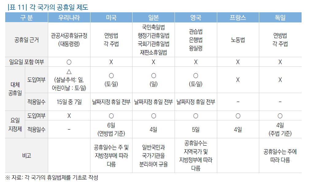 이를 해결하기 위해서는 일반 국민을 대상으로 하되 일요일을 제외한 휴일법을 마련해 관공서 공휴일 규정과 양립토록 하거나, 일본처럼 국민의 휴일과 관공서의 휴일을 별도 법률로 각각 제정하는 방안을 제시했다.