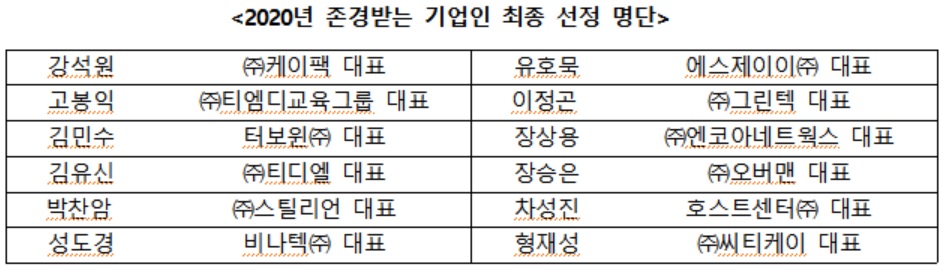 존경받는 기업인은 근로자와 함께 성장하는 사람 중심의 기업경영을 적극 실천하는 모범 중소기업인을 말한다. 중기부는 2016년부터 존경받는 기업인을 선정해 올해 12명을 포함, 총 48명을 선정했다.
