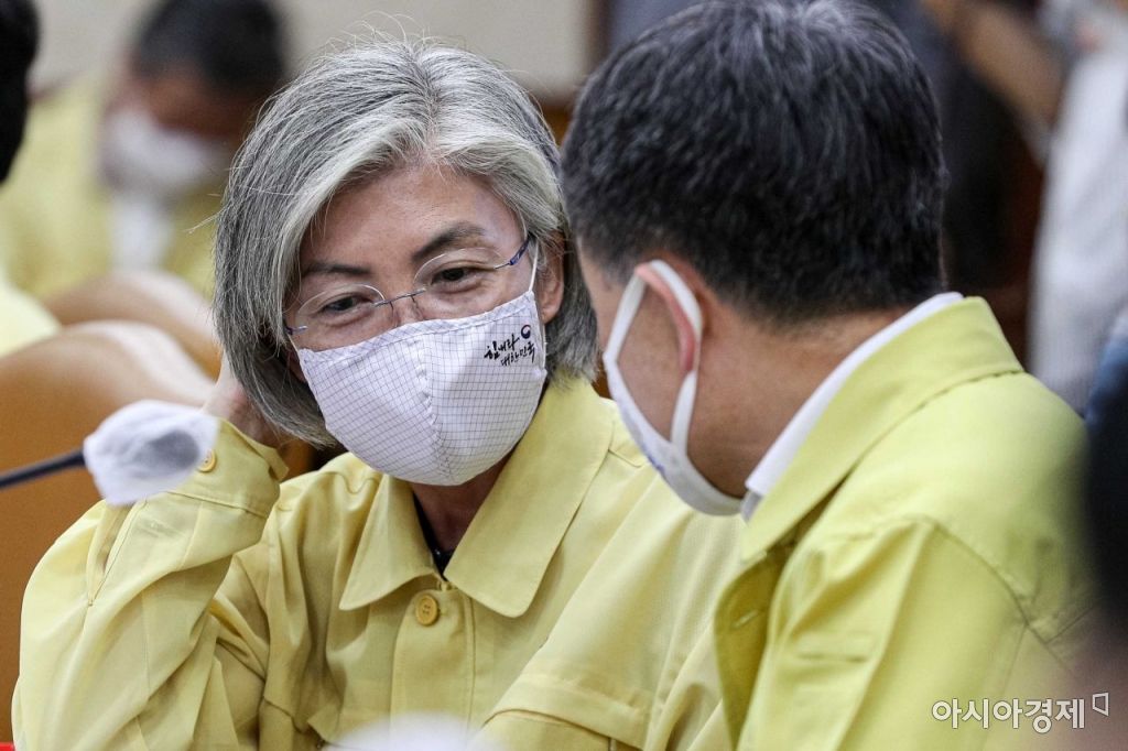 강경화 외교부 장관과 박능후 보건복지부 장관이 5일 서울 종로구 정부서울청사에서 열린 '코로나19 대응 중앙재난안전대책본부 회의'에 참석해 의견을 나누고 있다./강진형 기자aymsdream@