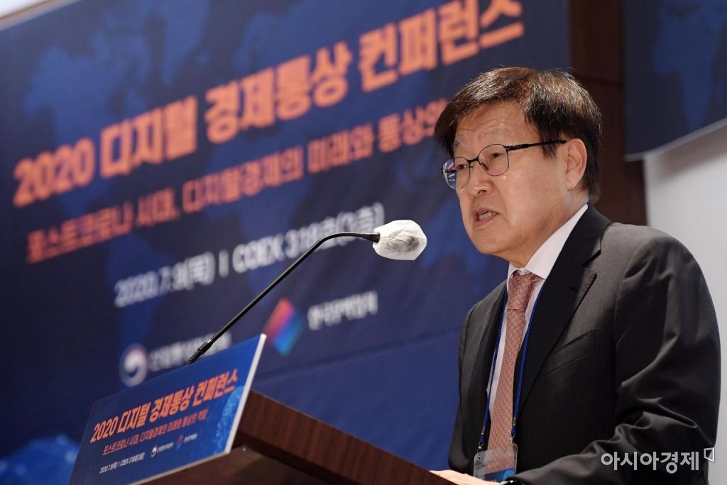 김영주 무역협회장이 9일 서울 강남구 코엑스에서 열린 '2020 디지털 경제 통상 컨퍼런스'에서 개회사를 하고 있다./김현민 기자 kimhyun81@