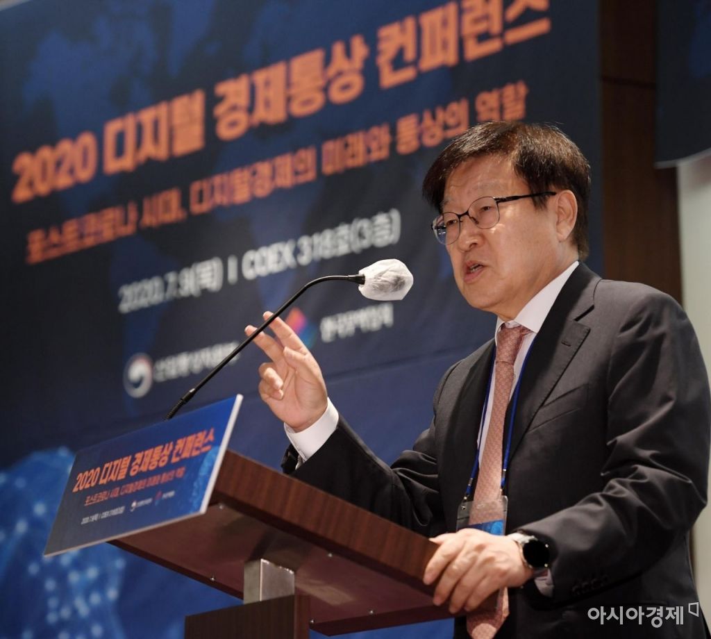 김영주 무역협회장이 9일 서울 강남구 코엑스에서 열린 '2020 디지털 경제 통상 컨퍼런스'에서 개회사를 하고 있다./김현민 기자 kimhyun81@