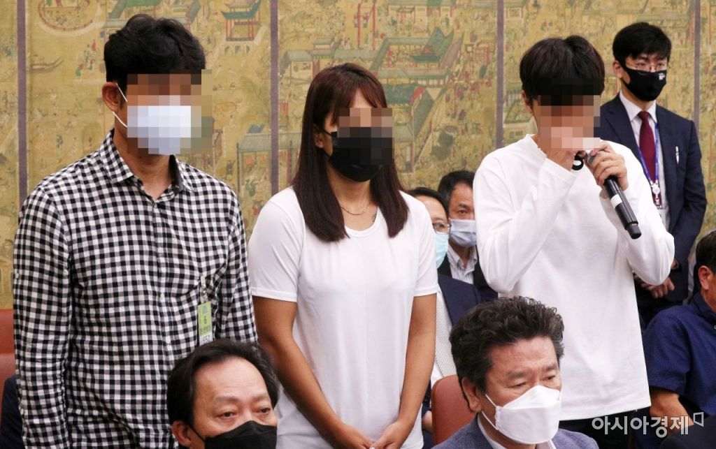 경주시청 트라이애슬론팀 감독과 선배 선수들이 6일 국회에서 열린 고 최숙현 선수 사망 사건에 관한 긴급 현안 질의에 출석, 의원들 질의에 답변 하고 있다./윤동주 기자 doso7@