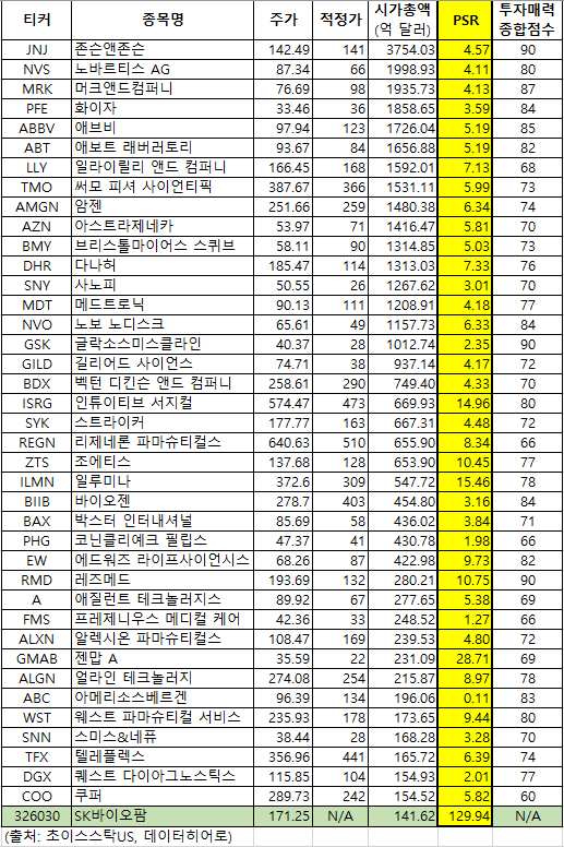 그외 국내에서 잘 알려져있는 헬스케어 관련 글로벌 기업인 존슨앤존슨(JNJ)의 PSR은 4.57배, 노바르티스(NVS) 4.11배, 머크앤드컴퍼니 4.13배, 화이자 3.59배 등 대부분 기업이 PSR 4배 전후 수준에서 거래되고 있다. SK바이오팜을 공모주 청약에서 놓친 투자자라면 미국 헬스케어 주식 중 매출과 수익이 검증되고 저평가된 종목에서 기회를 찾는 건 어떨까.