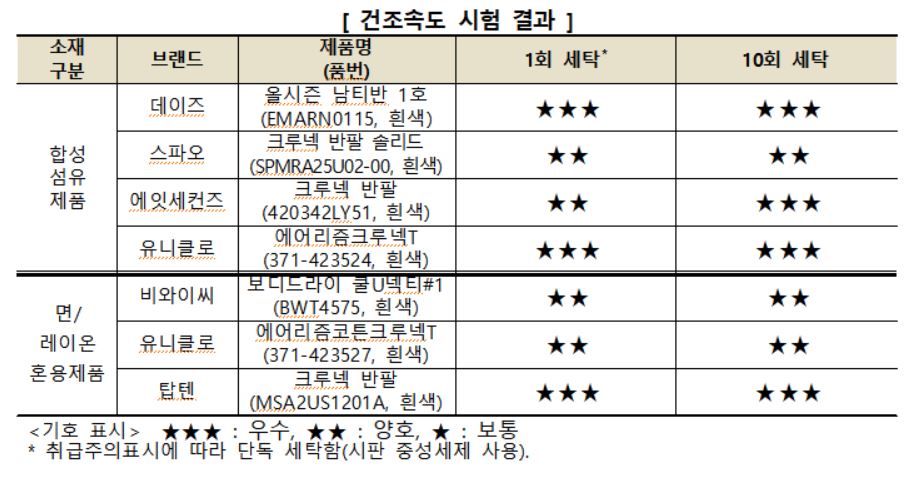 데이즈 ‘올시즌남티반1호’, 유니클로 ‘에어리즘크루넥T’, 탑텐 ‘크루넥반팔’ 제품은 10회 세탁 후에도 건조속도가 다른 제품보다 상대적으로 빨라 우수했다.