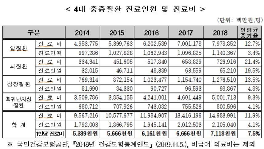 15일 생명보험협회에 따르면, 암, 뇌혈관질환, 심장질환, 희귀난치성질환 등 4대 중증질환의 최근 5년간(2014~2018년) 진료비 증가율은 연평균 11.9%을 기록했다. 뇌질환 진료비 증가율이 연평균 21.4%로 가장 높았고, 심장질환이 13.5%, 암질환이 12.7%, 희귀난치성 질환이 9.3% 순이었다. 4대 중증질환의 1인당 진료비도 최근 5년간 연평균 7.5%씩 증가해 2018년에는 711만8000원이었다.