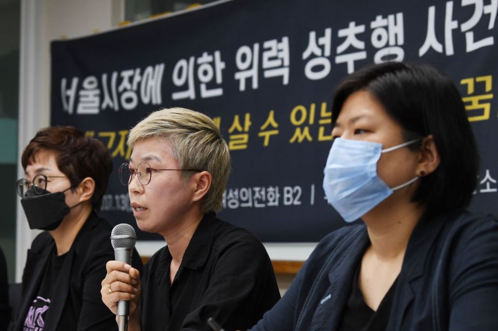 김재련 법무법인 온·세상 대표 변호사(오른쪽 두 번째)가 지난 13일 오후 서울 은평구 한국여성의전화에서 열린 서울시장에 의한 위력 성추행 사건 기자회견에서 경과보고를 하고 있다. [이미지출처=연합뉴스]