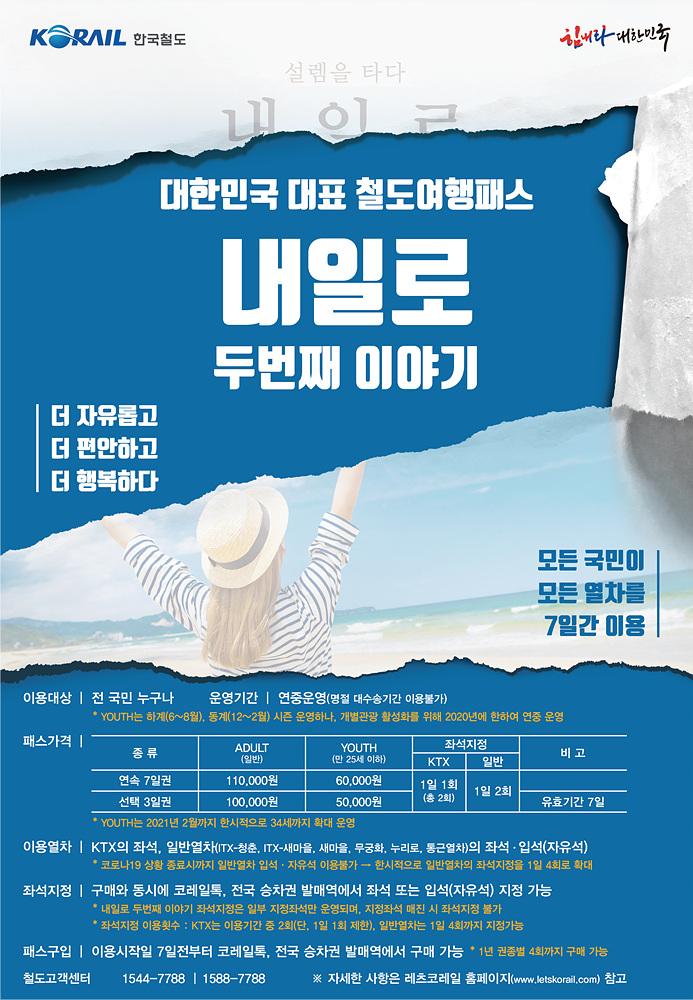 코레일은 KTX 좌석 이용이 가능하고 나이 제한을 없앤 새로운 자유여행패스 ‘내일로 두 번째 이야기’를 21일 출시한다고 20일 밝혔다.