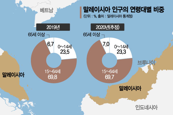 반면 말레이시아에서 유소년층(0~14세)과 생산가능인구(15~64세)는 모두 줄어들 것으로 예측된다. 유소년 인구 비중은 지난해 23.5%에서 23.3%로 0.2%포인트 감소하며, 생산가능인구는 69.8%에서 69.7%로 0.1%포인트 줄어들 전망이다. 특히 이런 추세가 이어질 경우 65세 인구가 전체 인구의 14%를 웃도는 고령사회의 가시권에 진입할 것으로 보인다. 세계은행(WB)에 따르면 말레이시아의 고령사회 진입 시점은 2044년이다.