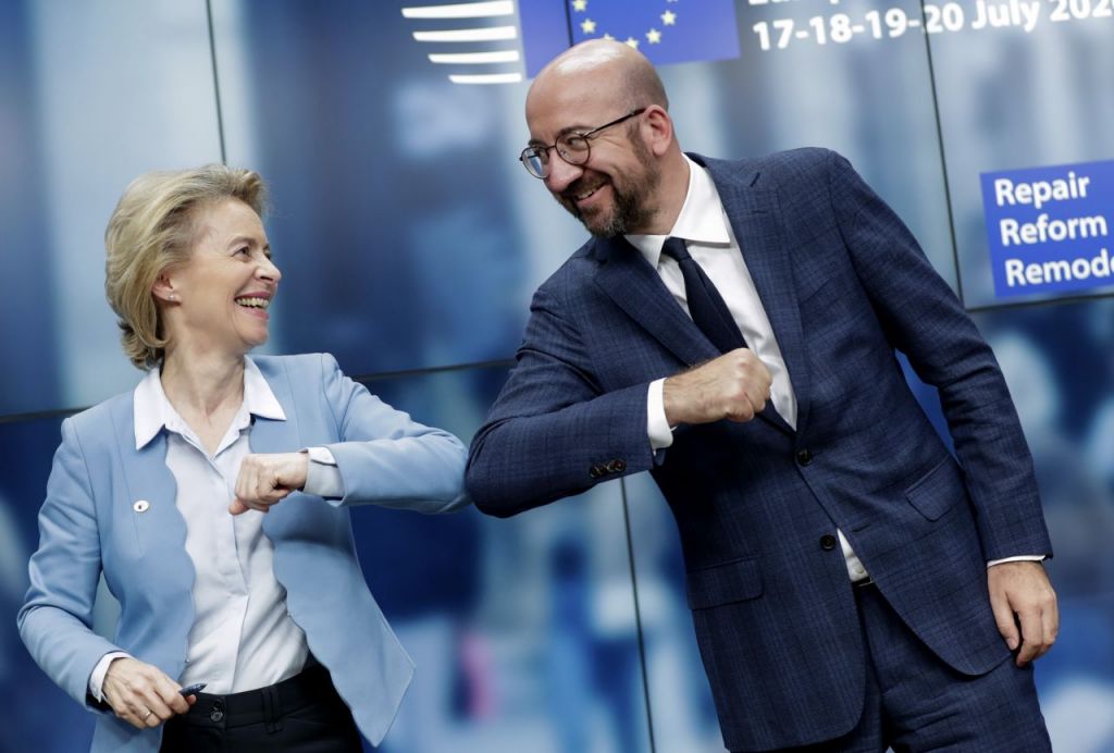 우르줄라 폰데어라이엔 유럽연합(EU) 집행위원장(왼쪽)과 샤를 미셸 EU 정상회의 상임의장이 21일(현지시간) 벨기에 브뤼셀에서 열린 EU 정상회의에서 기자회견을 마치고 팔꿈치 인사를 하고 있다. [이미지출처=연합뉴스]