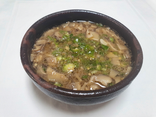 된장 2큰술, 다진 마늘 1작은술, 다진 생강 1/2작은술, 꿀 1/2작은술, 참기름 1/2큰술, 양지머리국물 1컵, 소고기 60g, 표고버섯 3장, 풋고추 2개