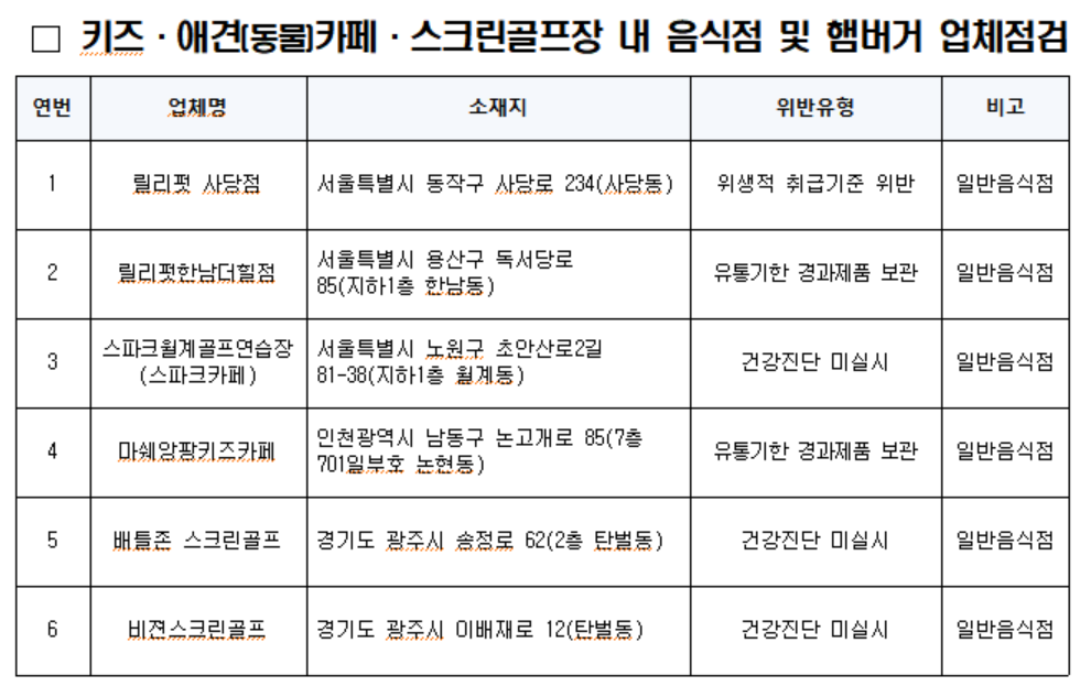 [아시아경제 조현의 기자] 식품의약품안전처는 키즈카페, 애견·동물카페, 햄버거 프랜차이즈 매장, 스크린 골프장 등 다중이용시설 378곳 중 식품위생법 위반 업체 6곳을 적발했다고 23일 밝혔다.