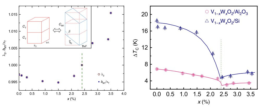 이 교수는 다양한 농도의 텅스텐이 도핑된 이산화바나듐 박막을 제작하고, 고온과 저온에서의 격자상수(결정 구조 인자)를 분석했다. 그 결과 두 개의 서로 다른 상의 특정 방향의 격자상수가 비슷한 값을 가질 때 금속-절연체 상전이의 이력특성이 크게 감소하는 것을 밝혔다.