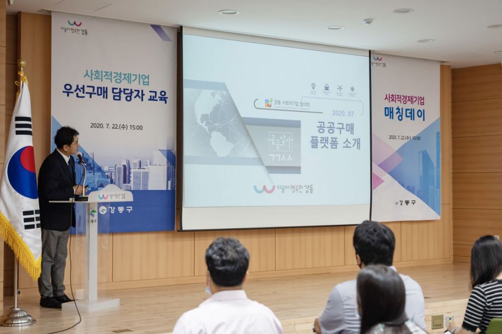 [아시아경제 박종일 기자] 강동구(구청장 이정훈)가 신종 코로나바이러스 감염증(코로나19)로 위축된 사회적경제를 활성화하고 사회적경제기업의 판로 개척을 지원하기 위해 지난 22일 구청 5층 대강당에서 ‘사회적경제기업 우선구매 담당자 교육 및 매칭데이’를 열었다.