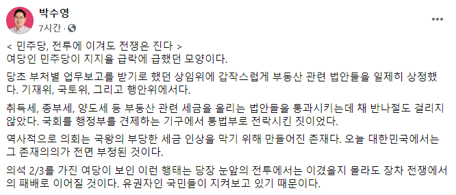 그는 "당초 부처별 업무보고를 받기로 했던 상임위에 갑작스럽게 부동산 관련 법안들을 일제히 상정해 취득세, 종부세, 양도세 등 부동산 관련 세금을 올리는 법안들을 통과시키는 데 채 반나절도 걸리지 않았다"며 "국회를 행정부를 견제하는 기구에서 통법부로 전락시킨 짓"이라고 지적했다.