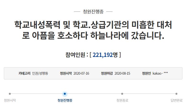 또 "아들이 자려고 하면 (가해자들이) 이불을 걷고 자위행위를 했다"며 "(가해자들은) '그냥 때리고 싶은 생각이 든다'며 놀리고 때렸다고 한다"고 덧붙였다. 해당 청원은 29일 오후 1시 기준 22만명 이상의 동의를 얻어 청와대 답변 요건을 충족했다.