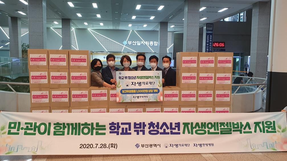 부산시는 28일 자생의료재단과 코로나19에 지친 학교 밖 청소년들을 위한 ‘자생엔젤박스 전달식’을 갖고 자생엔젤박스 100개를 기탁받았다고 29일 밝혔다.