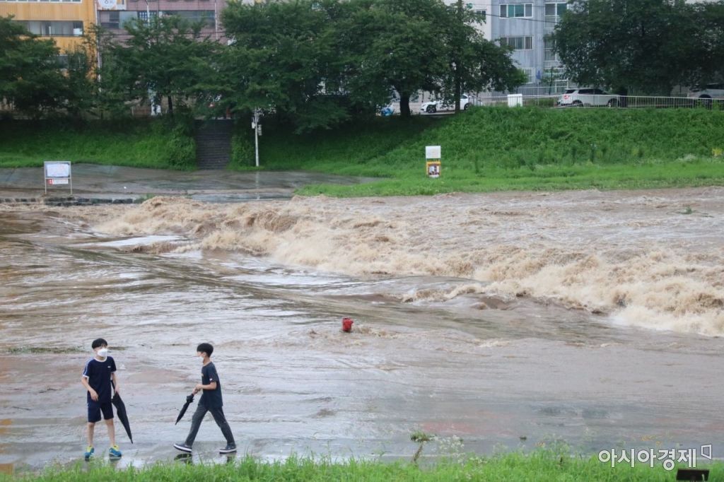 지난 28일부터 내린 장맛비가 29일 오후까지 이어지고 있는 가운데 학생 두 명이 불어난 광주천 산책로를 위태롭게 걷고 있다.