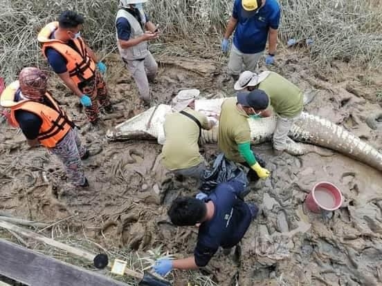 지난달 31일(현지시간) 말레이시아 수색당국이 포획한 악어의 배를 갈라 실종 소년 흔적을 확인하는 모습. / 사진=사라왁주 소방당국 인스타그램