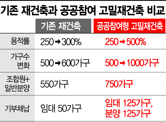 [아시아경제 최동현 기자] 정부가 4일 발표한 주택공급 확대방안의 핵심은 '공공참여형 고밀도 재건축' 도입이다. 한국토지주택공사(LH)와 서울주택도시공사(SH) 등 공공이 재건축에 참여할 경우 현재 서울시 조례상 250%인 3종 주거지역 용적률 상한을 준주거지역 수준인 500%까지 늘려 지을 수 있도록 하는 제도다. 예컨대 500가구짜리 단지에 300%의 용적률을 적용하면 600가구밖에 못 짓지만 500%로 늘려주면 1000가구까지 지을 수 있다. 재건축을 통해 가구 수를 2배로 늘릴 수 있는 셈이다. 이 경우 35층으로 제한된 주거지역 층수 제한도 최대 50층까지 허용한다. 정부는 이 같은 방법으로 재건축의 공공성을 강화해 서울에서 5만가구를 공급할 계획이다.