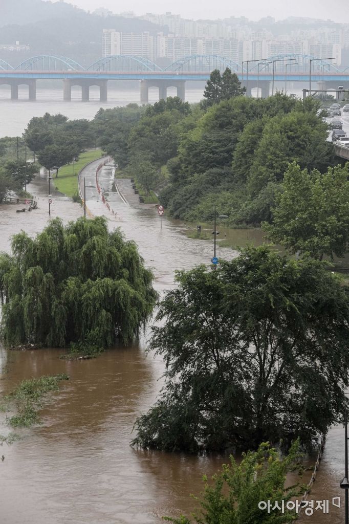 5일 서울 반포한강공원 일대가 수도권 집중 호우로 한강 수위가 상승하며 물에 잠겨 있다./강진형 기자aymsdream@
