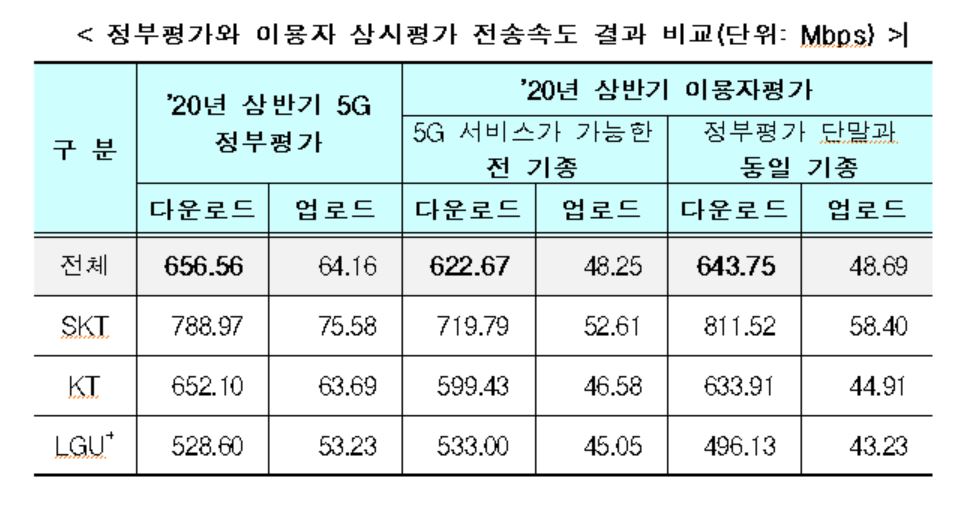 한편 이용자가 자신의 단말로 직접 측정하는 이용자 상시평가 결과는 ▲평균 다운로드 속도 622.67Mbps ▲업로드 속도 48.25Mbps로 정부평가 결과와 유사했다.