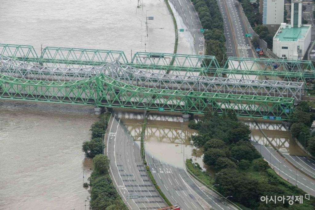 연이은 폭우로 한강수위가 상승하고 있는 6일 서울 여의도 63스퀘어 전망대에서 바라본 올림픽대로에 한강이 범람해 통행제한되고 있다./강진형 기자aymsdream@
