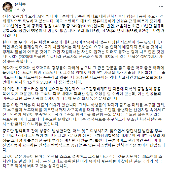 그는 "4차산업혁명의 도래, AI(인공지능)와 빅데이타 분야의 급속한 확대로 대학진학자들의 컴퓨터 공학 수요가 전 세계적으로 폭발하고 있다"며 "미국 스탠퍼드 대학의 컴퓨터공학과 인원은 근래 빠르게 증가해 2020년에는 전체 공과대 정원 1463명 중 745명(50.9%)이지만 서울대는 최근 10년간 컴퓨터공학과의 정원이 55명에서 변동이 없다. 고려대(115명, 14.3%)와 연세대(66명, 8.2%)도 마찬가지"라며 이같이 지적했다.