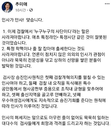 마지막으로 추 장관은 “인사의 메시지는 앞으로도 아무런 줄이 없어도 묵묵히 일하는 대다수의 검사들에게 희망과 격려를 드리고자 하는 것”이라며 글을 마무리했다.
