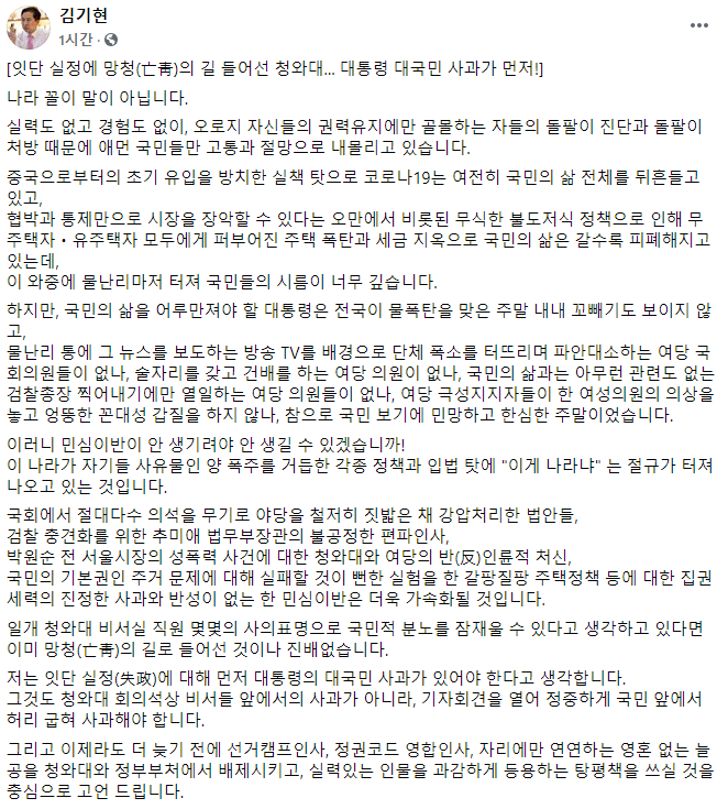 김 의원은 "잇단 실정에 대해 먼저 대통령의 대국민 사과가 있어야 한다고 생각한다"며 "청와대 회의석상 비서들 앞에서의 사과가 아니라, 기자회견을 열어 정중하게 국민 앞에서 허리 굽혀 사과해야 한다"고 지적했다.