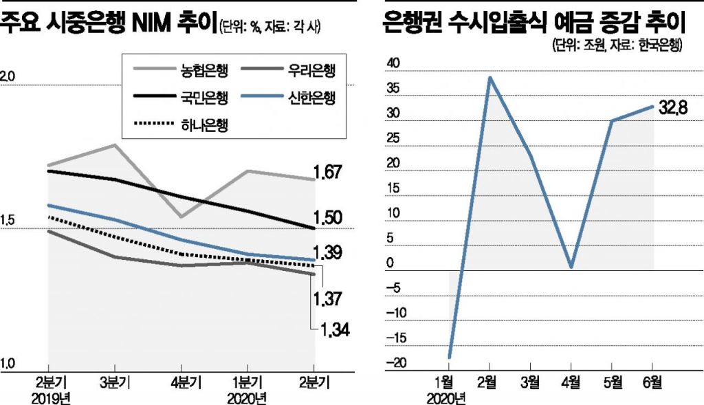 [아시아경제 조강욱 기자] 신종 코로나바이러스감염증(코로나19)이 장기화하는 가운데 시중은행들의 수익성 악화와 부실대출 증가 등으로 하반기 실적 감소 및 건전성 악화를 우려하는 목소리가 커지고 있다. 반면 일각에서는 3분기 저점을 찍고 4분기에는 회복 반열에 진입할 수 있을 수 있다는 전망도 제기된다. 상반기 급격하게 치솟았던 대출성장률 곡선이 완만해지고 저원가성 예금이 늘면서 핵심수익원인 순이자마진(NIM)이 3분기 이후 회복할 수 있다는 분석에서다.