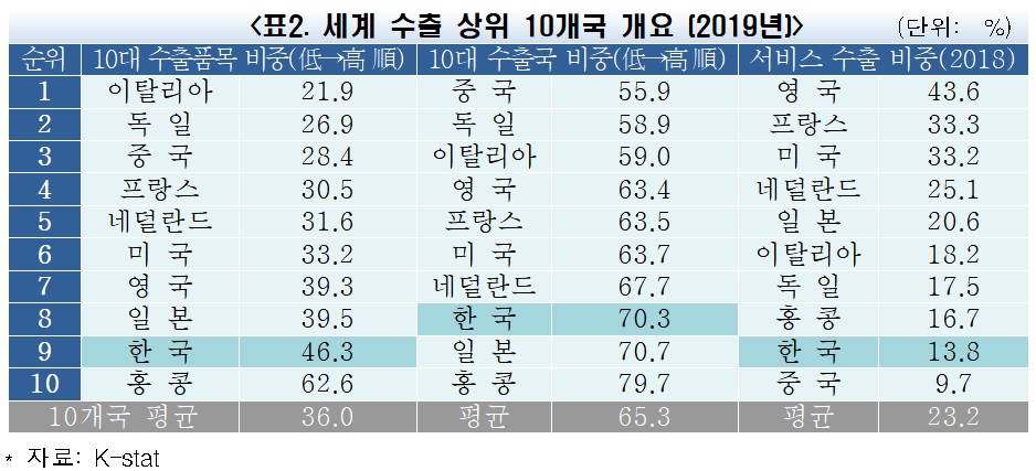 전국경제인연합회는 지난해 기준 세계 10대 수출국을 대상으로 수출품목, 지역 및 서비스 수출 비중을 분석한 결과 한국의 10대 수출품목 의존도는 46.3%로 9위를 기록했다고 12일 밝혔다.