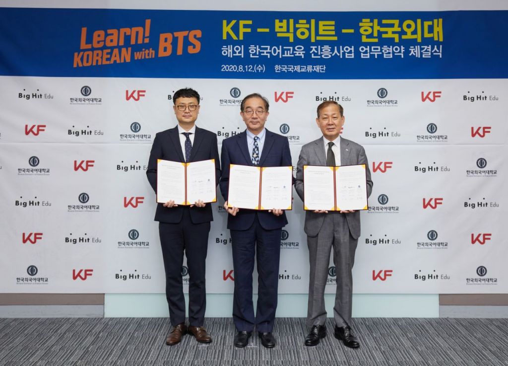 [아시아경제 임철영 기자] KF(한국국제교류재단)이 12일 KF 글로벌센터에서 빅히트 엔터테인먼트의 교육 독립법인인 빅히트 에듀, 한국외국어대학교와 해외 한국어 학습 활성화를 위한 업무협약을 체결했다. 협약식에는 이근 KF 이사장 및 최영남 빅히트 에듀 사업대표, 김인철 한국외대 총장을 비롯 각 사업주체 주요 관계자가 참석했다.