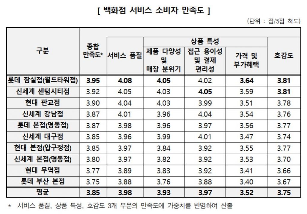 세 항목의 가중치를 반영해 평균값을 낸 종합만족도는 5점 만점으로 롯데백화점 월드타워점 3.95점, 신세계백화점 센텀시티점 3.92점, 현대백화점 판교점 3.90점, 신세계백화점 강남점·롯데백화점 본점(명동점) 3.87점 등이었다.