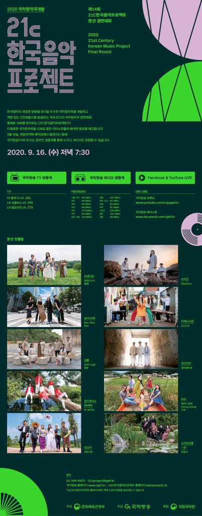 [아시아경제 박병희 기자] 문화체육관광부가 주최하고 국악방송이 주관하는 '2020 국악창작곡개발-제14회 21C한국음악프로젝트' 본선 경연대회가 오는 9월16일 오후 7시30분 국립국악원 예악당에서 개최된다.