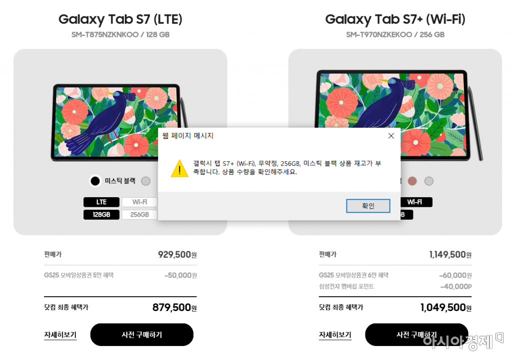 삼성닷컴 갤럭시탭S7 주문 페이지 캡처