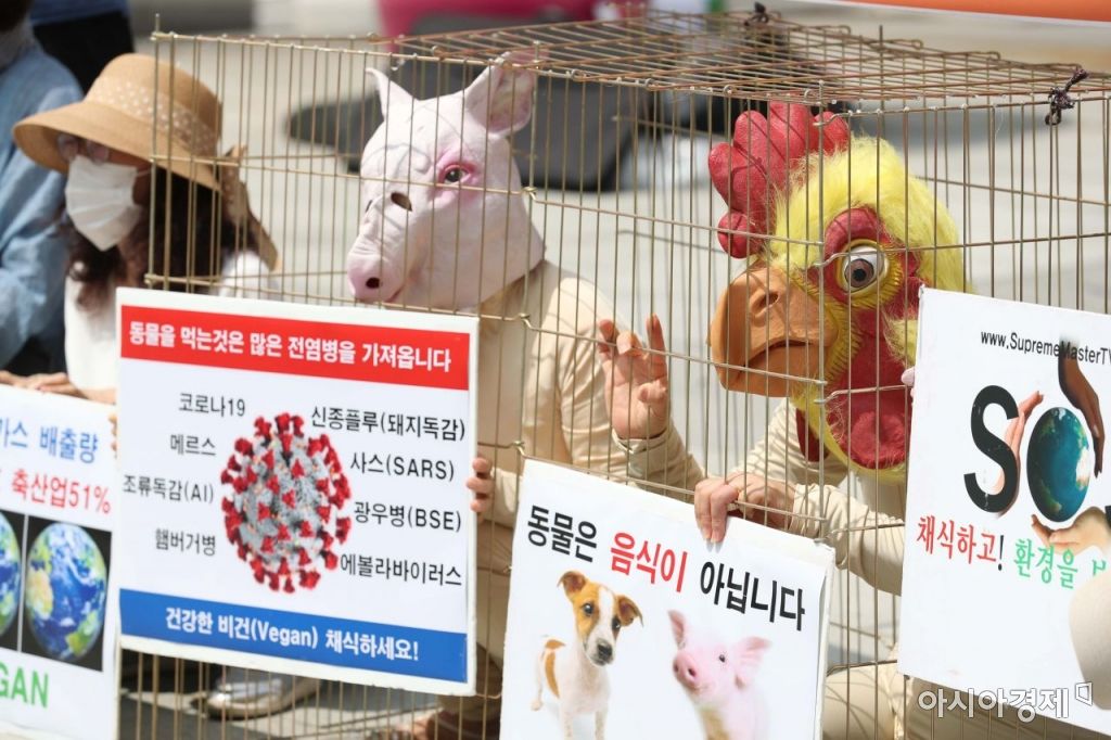 비건 세상을 위한 시민모임 관계자들이 19일 서울 종로구 광화문광장에서 세계 인도주의의 날을 맞아 기자회견을 열고 동물 착취 중단 및 비건 채식을 촉구하고 있다. /문호남 기자 munonam@