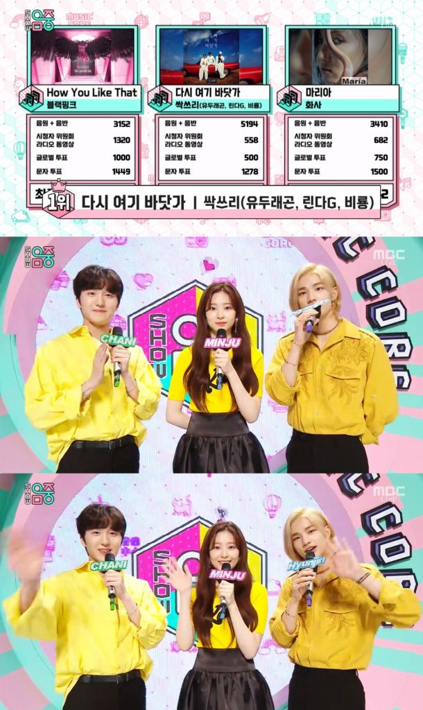 이날 '쇼! 음악중심'에서는 블랙핑크의 'How You Like That', 화사의 '마리아', 싹쓰리의 '다시 여기 바닷가'가 1위 후보에 올랐다. 세 후보가 모두 방송에 참석하지 않은 가운데, 최다 투표율을 얻은 싹쓰리 '다시 여기 바닷가'가 1위를 기록, 3관왕이 되었다.