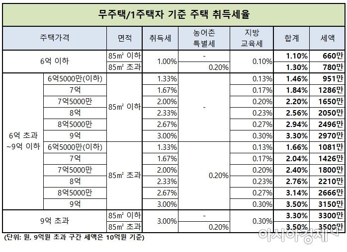 즉 6억원인 100㎡ 주택을 구매할 경우 취득세 600만원(1%)에 농어촌특별세 120만원(0.2%), 지방교육세 60만원(0.1%)이 붙어 총 780만원을 내면 되고, 10억원인 같은 면적 주택을 살 경우 취득세 3000만원(3%), 농어촌특별세 200만원(0.2%), 지방교육세 300만원(0.3%)를 합친 3500만원을 납부해야 합니다.