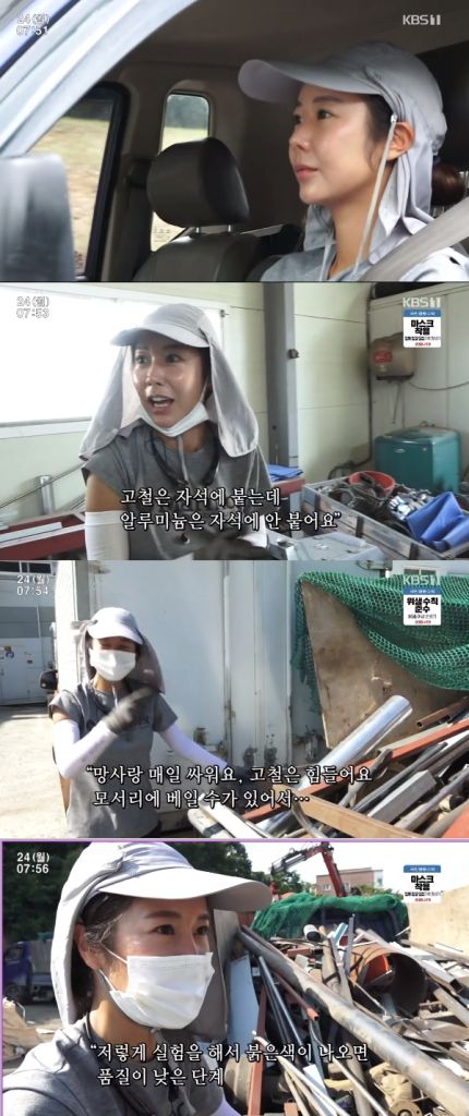 24일 방송된 KBS 1TV 교양 프로그램 '인간극장'에서 동네 최연소 여자 고물장수인 변유미 씨가 금속을 구분하는 방법을 설명하고 있다. 사진=KBS 1TV '인간극장' 방송 캡처