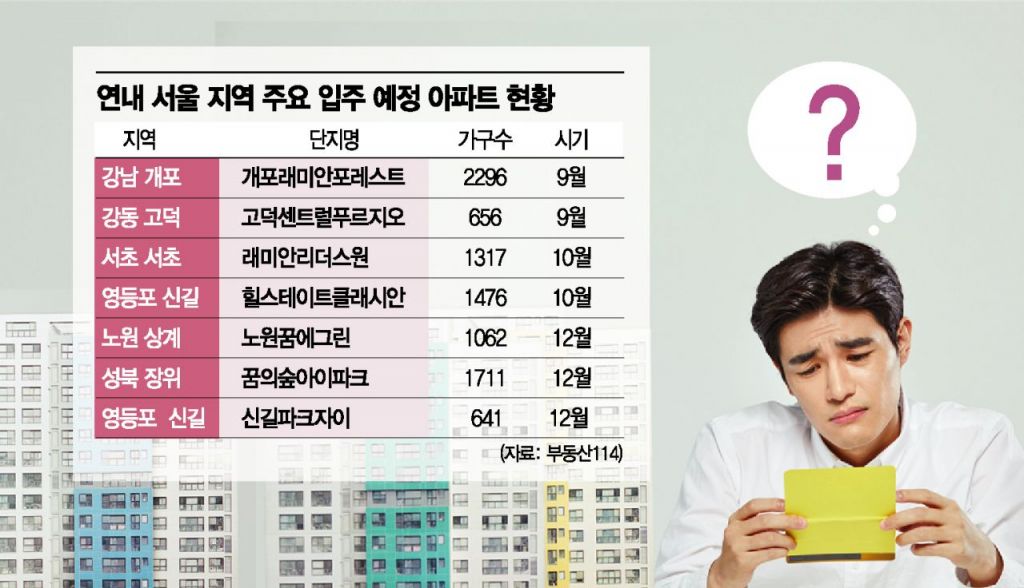 부동산114에 따르면 올해 남은 넉 달 서울에서 입주를 준비 중인 아파트는 총 1만479가구다. 분양 당시부터 수요자들의 관심이 컸던 강남권 단지들의 집들이가 올 가을 예정돼 있다. 강남구 개포동 개포래미안포레스트(9월, 2296가구), 강동구 고덕동 고덕센트럴푸르지오(9월, 656가구), 서초구 서초동 래미안리더스원(10월, 1317가구) 등이다. 신길 뉴타운에서도 입주가 이어진다. 영등포구 신길동 힐스테이트클래시안(10월, 1476가구), 신길파크자이(12월, 641가구) 등이 집들이에 나선다. 강북 대단지들도 연말 입주를 앞두고 채비를 한다. 노원구 상계동 노원꿈에그린(1062가구), 성북구 장위동 꿈의숲아이파크(1711가구)가 12월 집들이를 준비한다.