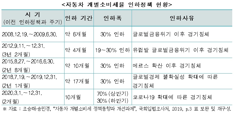 보고서는 자동차산업이 고용창출 효과 등 국가경제에 미치는 영향이 큰 것을 고려해 자동차를 개소세 과세대상에서 제외해야 한다고 강조했다. 이를 통해 신종 코로나바이러스감염증(코로나19) 사태 등으로 침체된 경기 부양 효과를 극대화할 수 있다는 주장이다.