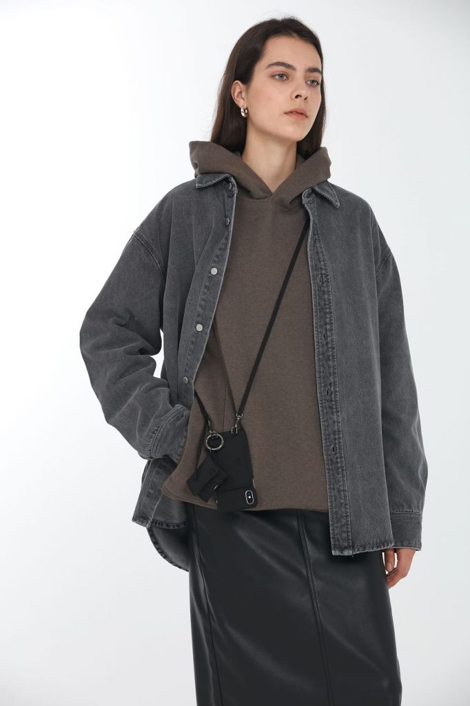 LF 던스트의 '유니섹스 오버핏 데님셔츠 재킷(외투)'과 '유니섹스 로고 크리스 후디(상의 이너)'.