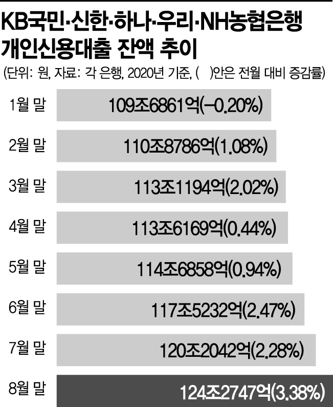 2일 은행권에 따르면 KB국민ㆍ신한ㆍ하나ㆍ우리ㆍNH농협 등 5대 시중은행의 지난 달 말 개인신용대출 잔액은 124조2747억원으로 전월 말보다 4조705억원(3.38%) 증가했다. 증가율이 전월(2.28%)에 견줘 1%포인트 넘게 커졌다. 월 단위 기준으로 역대 가장 높은 증가 규모다. 5대 은행의 개인신용대출 증가액은 올 3월 2조원대에서 4월 약 5000억원으로 내려갔으나 이후로 다시 가파른 증가세를 나타내고 있다.