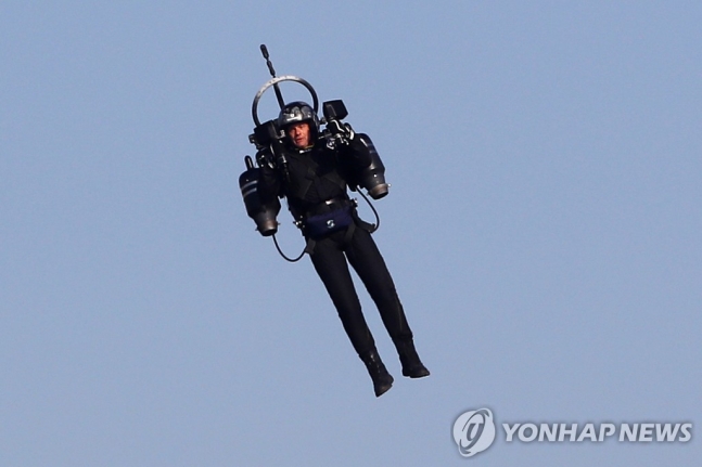 지난 2018년 4월 21일 한 남성이 제트팩을 메고 시험 비행을 하고 있다. 사진은 기사의 특정 표현과 무관함. [이미지출처=연합뉴스]