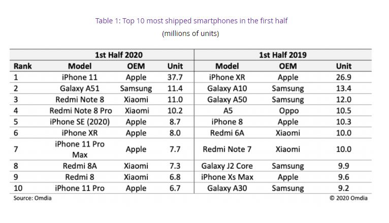 옴디아는 "애플이 지배했다"고 평가했다. 아이폰11과 아이폰SE의 성공에 힘입어 2분기 아이폰 출하규모는 1년 전보다 13% 늘어난 것으로 집계된다.