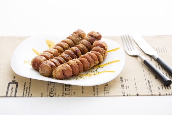1. 소시지 중앙에 세로로 꼬치를 끼운다.